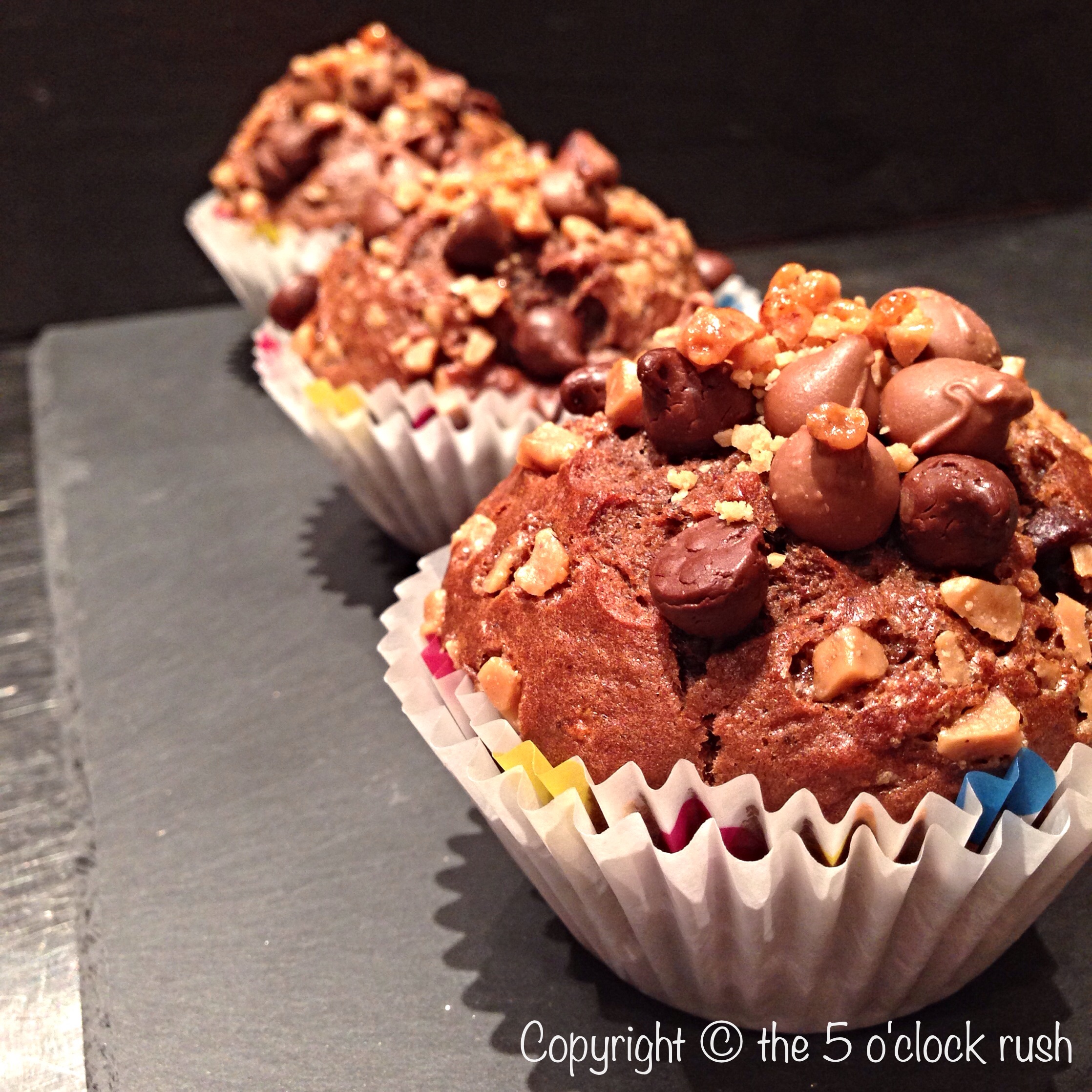 I must toot my own horn. The muffins turned out awesome; they are moist, with an overdose of chocolate and border on a cupcake without the frosting. 😀