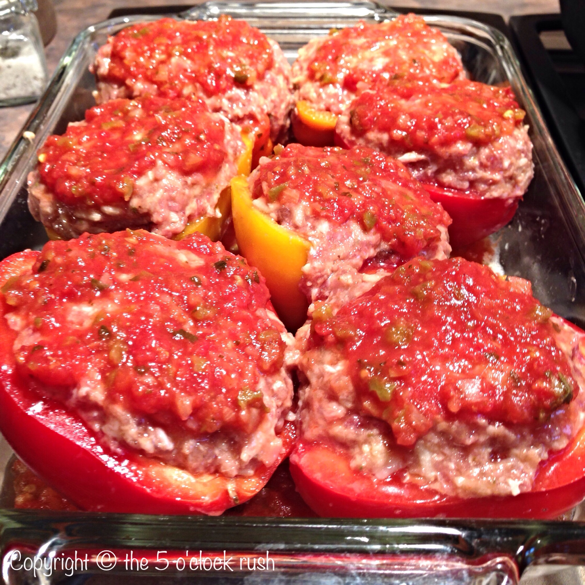 Fill each half of raw peppers with meat mixture. Make sure that the pepper is really stuffed as it will shrink with cooked. Place filled peppers into the prepared baking dish.