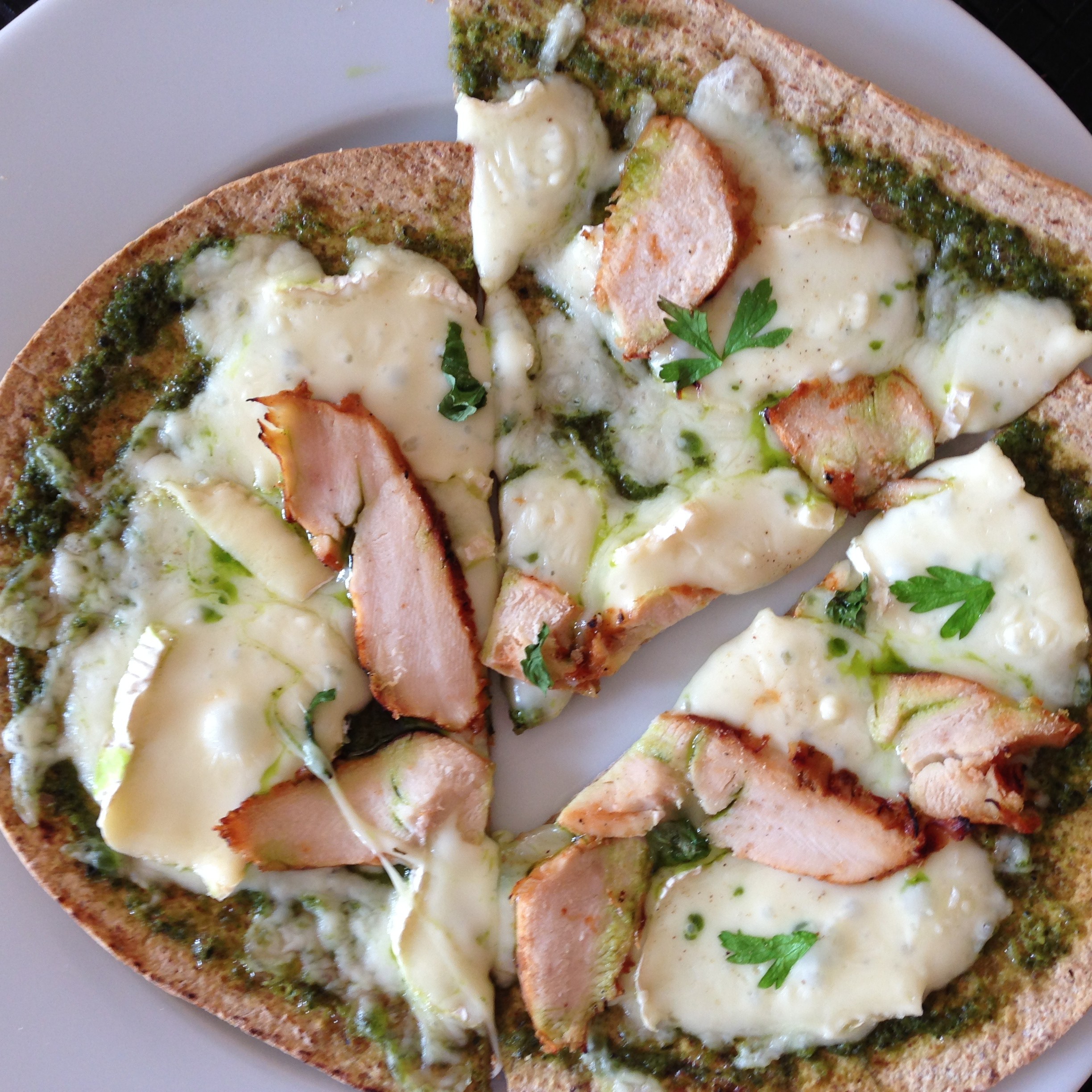 Whole Wheat Flatbread Pizza with BBQ Chicken, Brie and Pesto Sauce